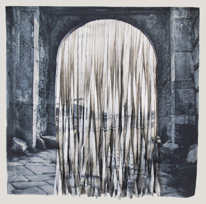 Quatre mousselines de coton imprimées (motif identique), teintées à l’encre, découpées et superposées